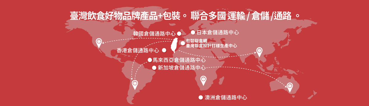 我們以臺灣聯盒網為包裝設計生產基地,聯合臺灣專業物流與倉儲中心,協助客戶進行海外運輸包裝規劃與製作。並以 1 解決方案,2物流配送,3各國通路規範注意。三大步驟將客戶產品安全節省的到達相關的國家通路。目前透過BNI系統平台,積極地開拓海外各國的倉儲通路渠道。